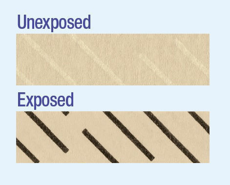 The chemical indicator ink, printed in a diagonal striped pattern, changes colour or turns darker when exposed to steam.