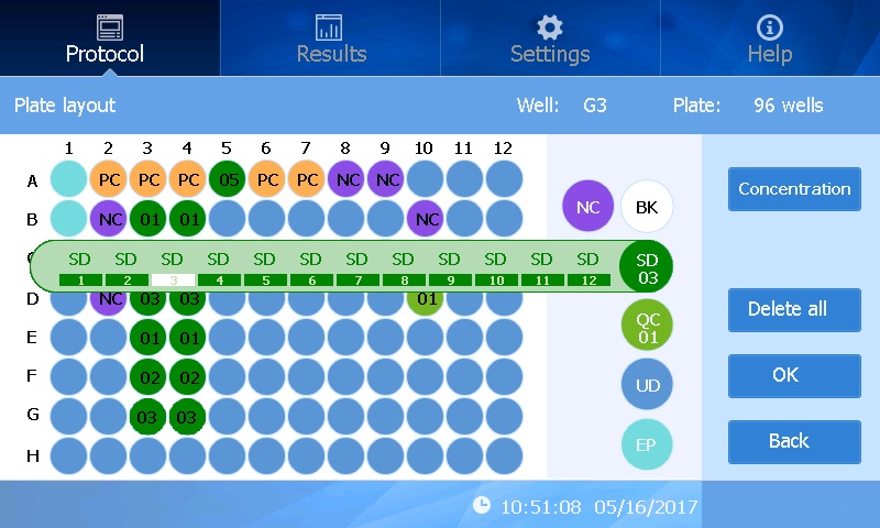 The plate layout interface allows for quick and intuitive set up of a plate’s well contents. The display shows a graphical representation of the 96 well plate, and the user can label each well as required for: “known standard”, “unknown sample”, “blank well”, “QC control well”, “negative control”, “positive control”, or “empty”. The interface allows highlighting and labeling multiple wells to save time. Measurement data is available immediately on the screen after a reading, as well as interpretations, calculated analysis and curve fittings.