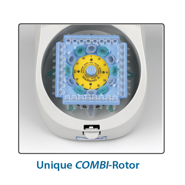 Benchmark Scientific MyFuge™ 12 Mini Centrifuge eliminates the need to change rotors when switching between microtubes and PCR strips unlike traditional mini centrifuges. The included, unique COMBI-Rotor™ is all that is required for running 12 microtubes and/or 4 PCR strips.