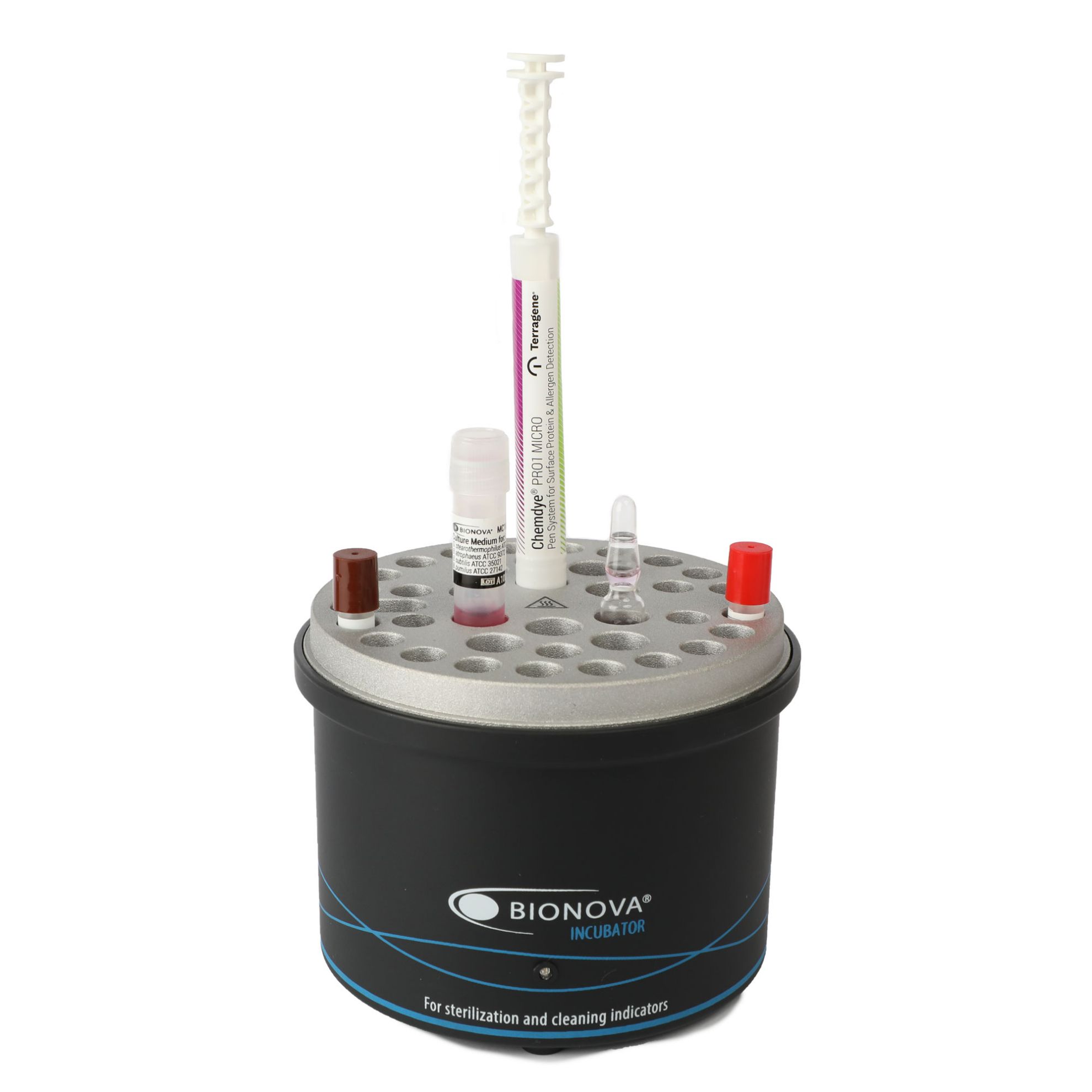 The Bionova® Biological Indicator Dual Incubator for biological indicators and hygiene monitoring systems features 26 x 0.9cm for BI's and 10 x 1.3cm positions for culture media tubes & environmental swabs. Includes ampoule crusher and special hole for an externl thermometer.