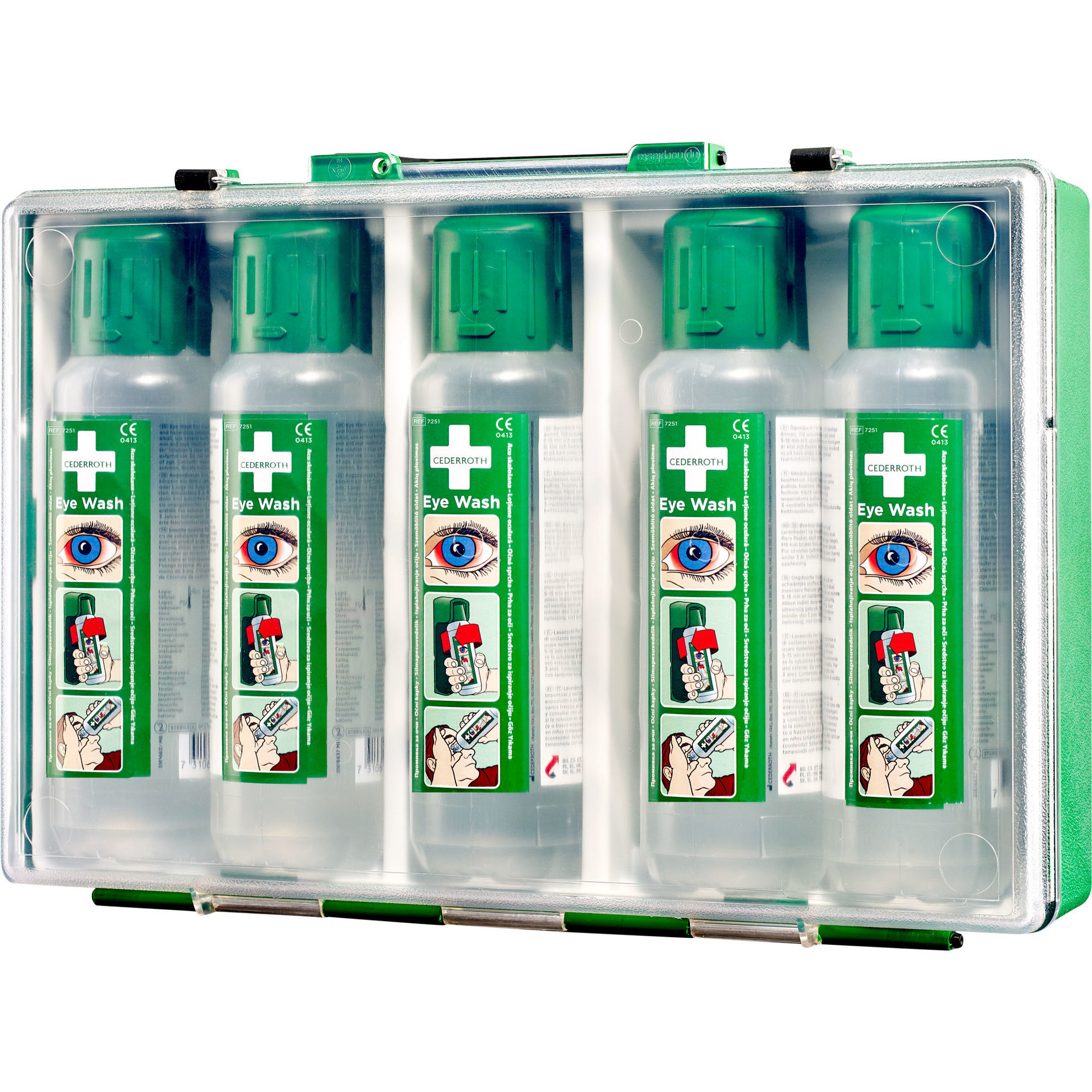Cederroth Eye Wash Case contains five 500 ml bottles of sterile isotonic borate buffered sodium chloride solution in portable case with a built-in handle. Convenient for mobile worksites or emergency use. Thermoset plastic case with transparent lid.