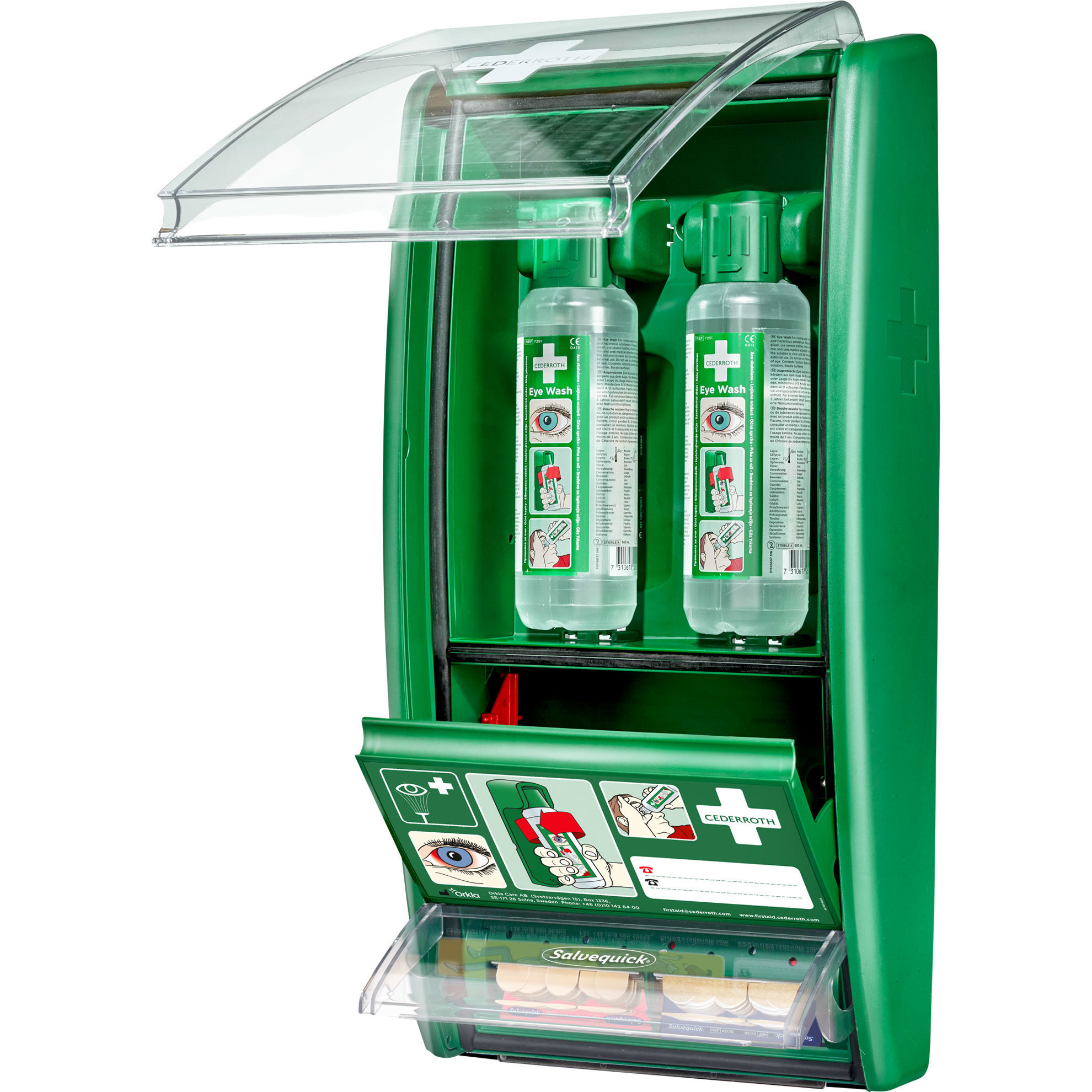 The Cederroth Eye Wash Station has been designed to enable you to get help as quickly as possible. The station has space for two bottles which open automatically when you twist them out of their brackets. The transparent windows allow for visual inspections of contents and the upper compartment includes a rubber gasket to keep out dust and humidity.