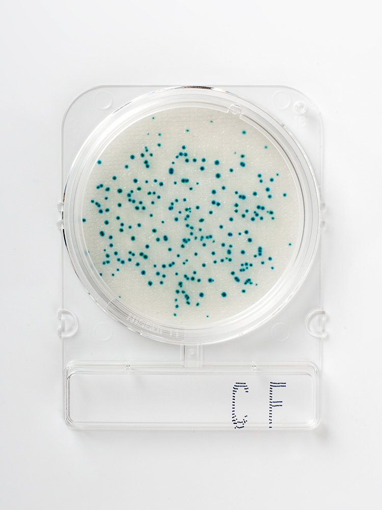 Coliforms are characterized as non-sporeforming Gram-negative bacilli, defined by their ability to ferment lactose, and to produce acid and/or carbon dioxide gas. The Compact Dry™ CF plate is used for rapid counting of coliforms, utilizing the X-Gal chromogenic substrate, which is synthesized forming blue/blue-green colonies. The growth of other types of bacteria is inhibited.