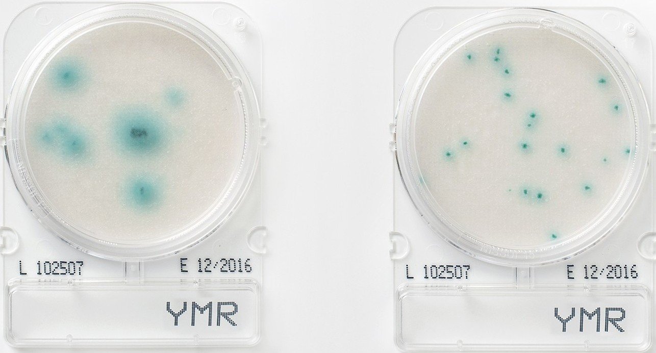 Yeast and mold display different colony morphology and color due to the chromogenic substrate present in the media. X-Phos is degraded by growing yeast presenting a blue coloration of the colony, yeast will appear as blue or cream colonies. Bacterial growth is inhibited by antibiotics. The head space in the Compact Dry™ plate allows mold to develop their characteristic filamentous shape due to growing mycelium.