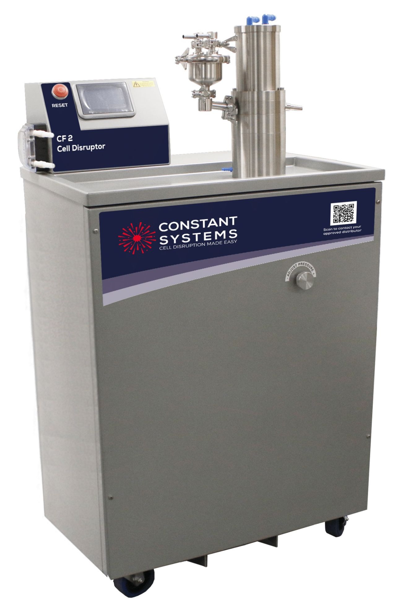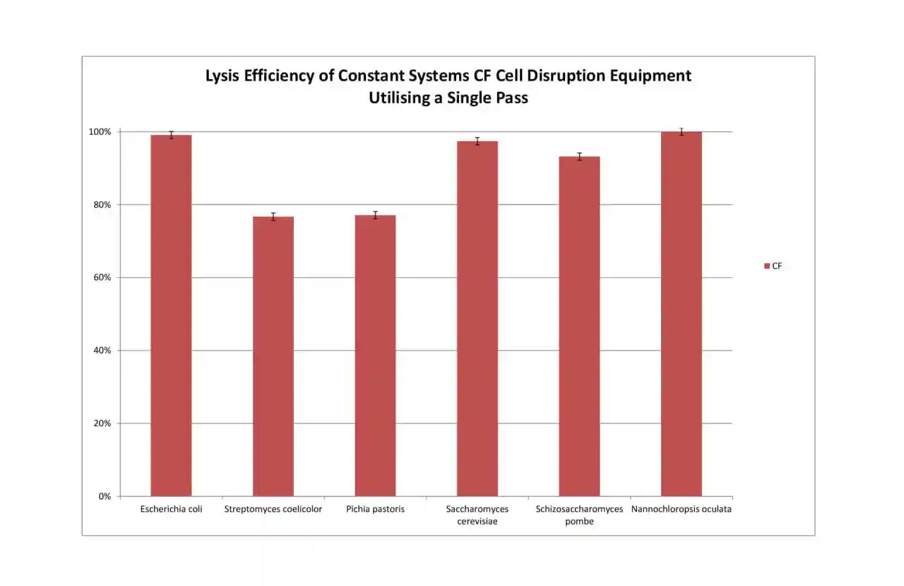 The CF Cell Disruptor offers Continuous Flow Processing with two models, the CF1 and CF2. Both models offer the same process and differ only by process speed, the CF1 offers up to 6L per hour and the CF2 offers up to 24L per hour processing rates. Both models benefit from a HMI control, a maximum process pressure of 40kpsi (2700 bar), integrated sample cooling jacket, 200ml inlet reservoir (hopper), auto shut down feature for when the process is complete and both models take advantage of Constant Systems precise and consistent hydraulic control which is fully scaleable through the whole product range from 0.5ml single preparation processing to large volume processing at 150L per hour. This precise control ensures that the entire sample is processed at the operators set pressure to ensure accurate and consistent results and in most cases a single process or pass is adequate meaning multiple passes are not required. Both models are capable of processing fluid or re-suspended sample types and are utilised for many sample types such as bacteria, yeast and algae.