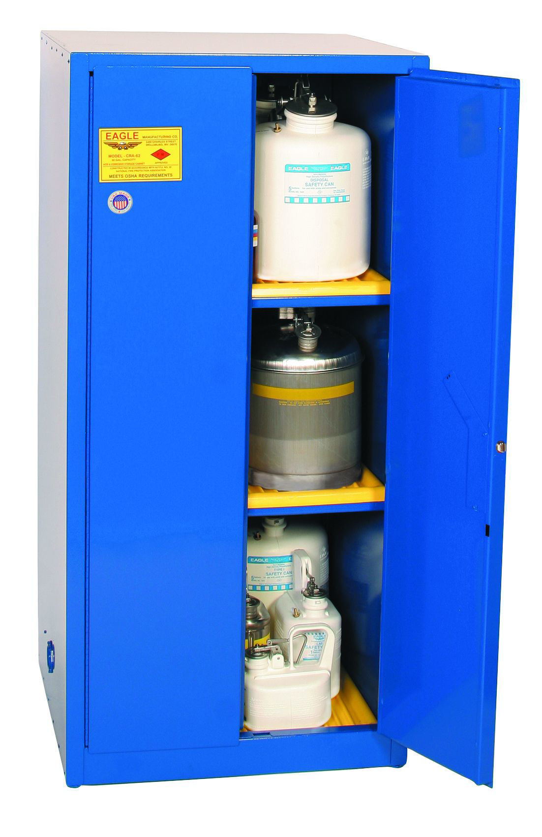 Eagle Manufacturing Acid Corrosive Safety Cabinets are constructed of 18-gauge (1 mm) steel. The sides, top, bottom, and doors are double-walled with a 1½” (3.8 cm) air space between walls. Includes two vents, each have 2” (5.1 cm) threaded fittings and a fire baffle and cap. Cabinets have a corrosion-resistant powder coat finish and includes trilingual warning label, plus grounding attachment, 3-point latch system, and 2” (5.1 cm) raised, leakproof door sill. Each shelf is adjustable on 3” (7.6 cm) centers, supported by 4 brackets, with a 350 lbs (159 kg) safe allowable load. Includes poly shelf and sump trays to help contain small spills and provide extra corrosion protection. Not recommended for use with sulfuric, nitric or hydrochloric acids. Cabinets meet NFPA Code 30 and OSHA requirements.