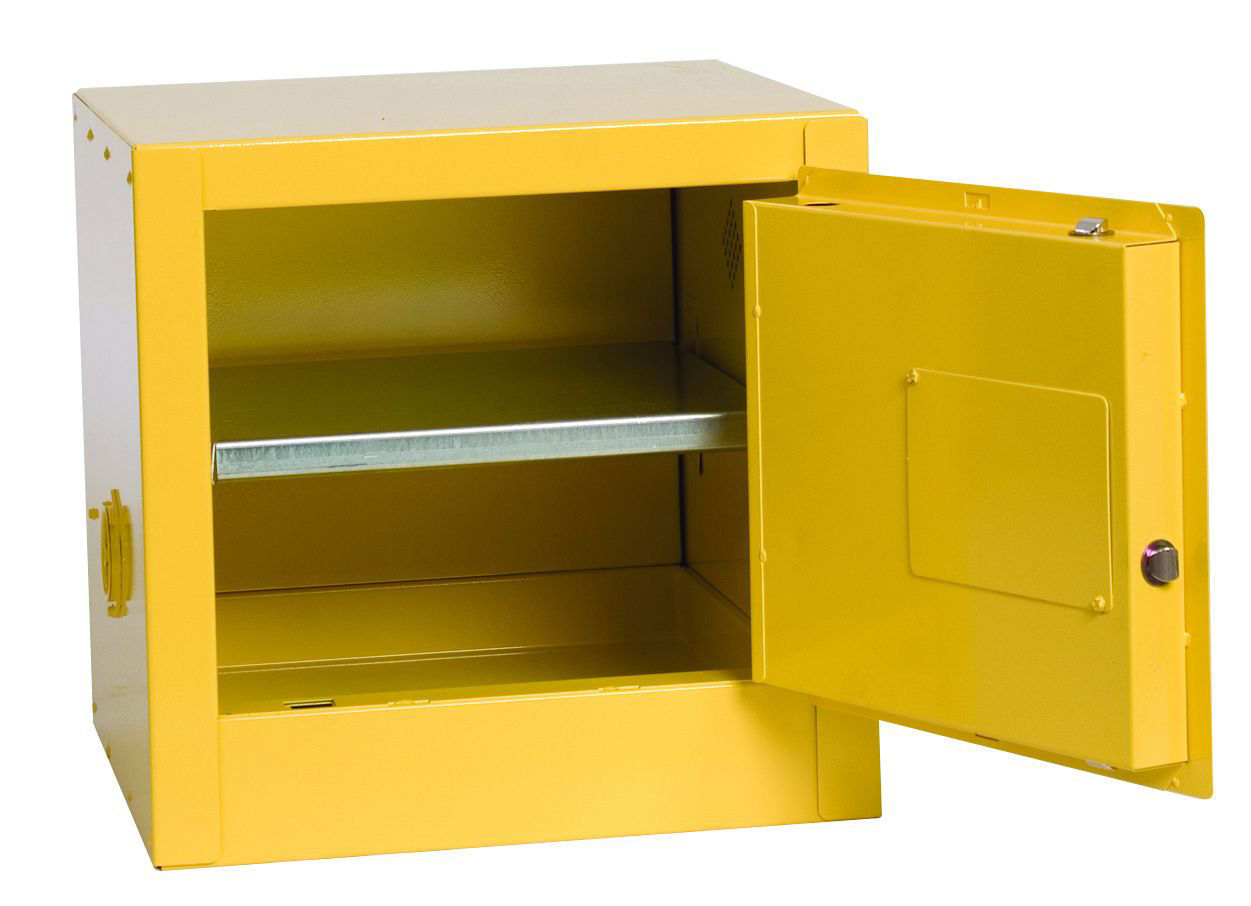 Eagle Manufacturing Flammable Liquid Safety Cabinets are constructed of 18-gauge (1 mm) steel. The sides, top, bottom, and doors are double-walled with a 1½” (3.8 cm) air space between walls. Includes two vents, each have 2” (5.1 cm) threaded fittings and a fire baffle and cap. Cabinets have a high gloss powder coat finish with red trilingual warning, plus grounding attachment, 3-point latch system, and 2” (5.1 cm) raised, leakproof door sill. Each shelf is adjustable on 3” (7.6 cm) centers, supported by 4 brackets, with a 350 lbs (159 kg) safe allowable load. Cabinets meet NFPA Code 30 and OSHA requirements.