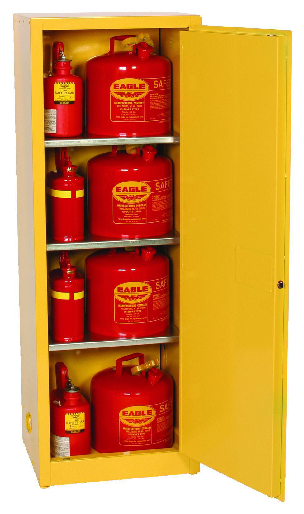 Eagle Manufacturing Flammable Liquid Safety Cabinets are constructed of 18-gauge (1 mm) steel. The sides, top, bottom, and doors are double-walled with a 1½” (3.8 cm) air space between walls. Includes two vents, each have 2” (5.1 cm) threaded fittings and a fire baffle and cap. Cabinets have a high gloss powder coat finish with red trilingual warning, plus grounding attachment, 3-point latch system, and 2” (5.1 cm) raised, leakproof door sill. Each shelf is adjustable on 3” (7.6 cm) centers, supported by 4 brackets, with a 350 lbs (159 kg) safe allowable load. Cabinets meet NFPA Code 30 and OSHA requirements.