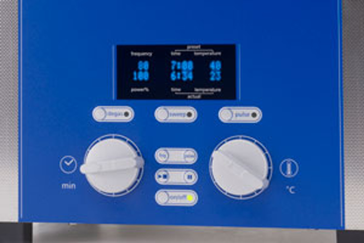 Once your cycle is programmed the Elmasonic P cleaner takes over.   Cavitation action and the timer start when the liquid reaches the set temperature.  Program the dual frequency function to operate at 37 or 80 kHz or to switch automatically between the two at 30 second intervals.   If there are particularly stubborn contaminants or you’re working with difficult samples activating the pulse mode sends 20% bursts of additional power through the solution to set things right.  And as an added convenience you can temporarily stop operations by activating the pause button.