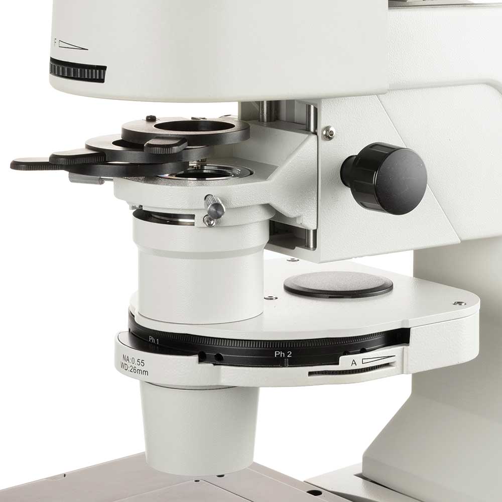 Rotating N.A. 0.55 condenser, iris diaphragm and PH rings for 10/20 and 40. Three filter holders. Tilting arm to backwards.