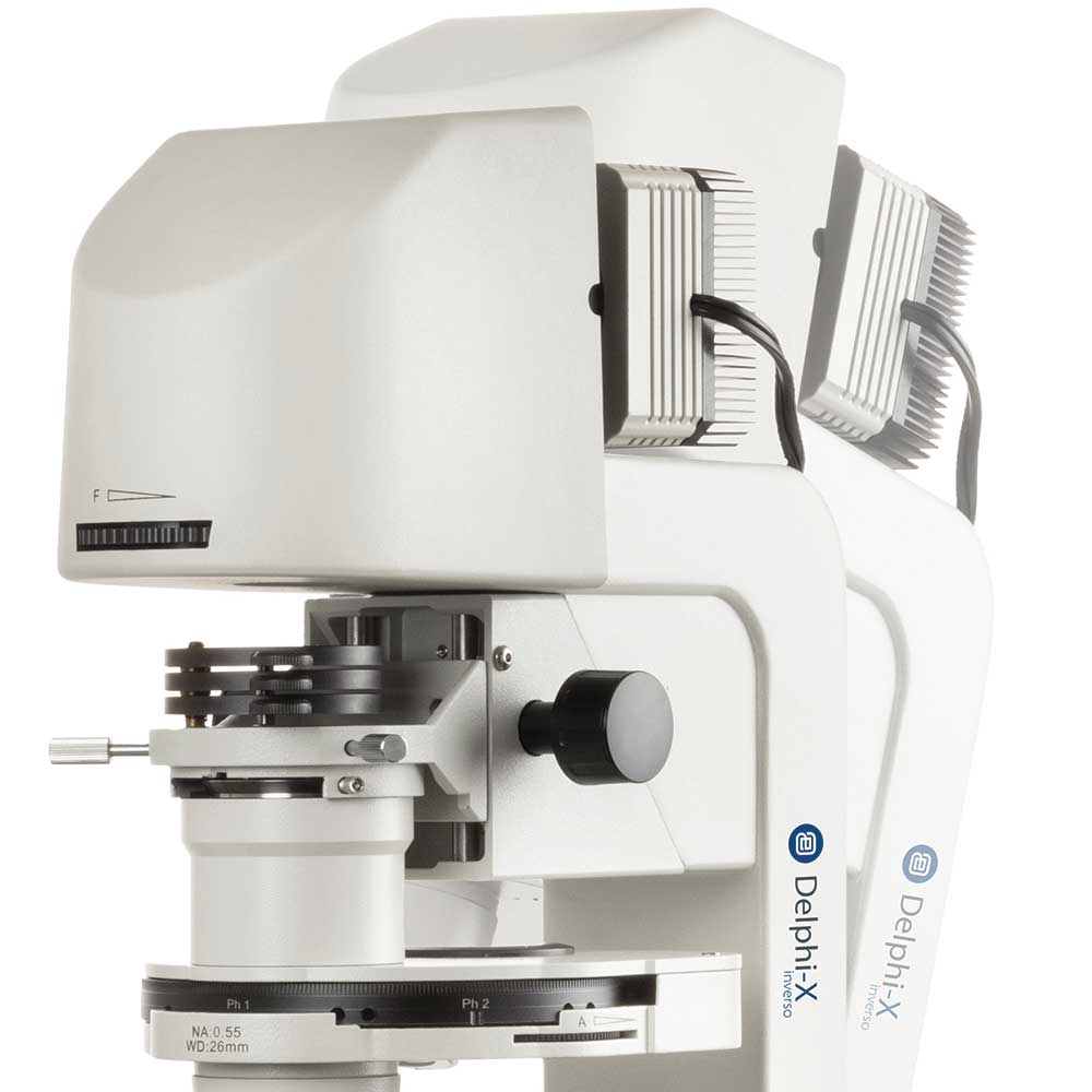 The Delphi-X Inverso Inverted Microscope is for professionals with demanding applications of living cell cultures and stained samples. Phase Contrast plus DIC (Differential Interference Contrast) Equipment provides enhanced contrast and enables detailed imaging of challenging samples, such as transparent or low-contrast specimens. It empowers you to observe living cells and tissues with exceptional clarity and precision. Super contrast Semi-Apochromatic objectives with collar adjustment ring (20x, S40x) assure perfect observation of cells or tissues in 1.2mm thick Petri dishes or flasks.
