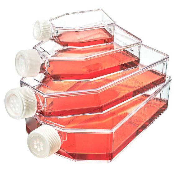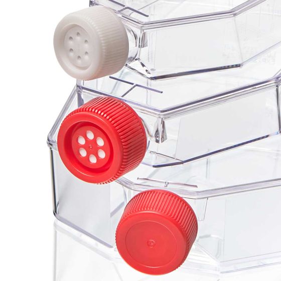 TC treated flasks have negatively charged, hydrophilic surfaces for excellent cell adherence and are available in both vented and plug seal cap styles. Red vented caps include a 0.22μm hydrophobic filter membrane to allow gas exchange while maintaining sterility inside the flask. Red non-vented plug seal caps can be fully closed for a gas and liquid tight seal or opened ¼ turn for open gas exchange. Non-treated flasks suitable for suspension cultures include white vented caps to readily distinguish them from the red capped TC treated options.