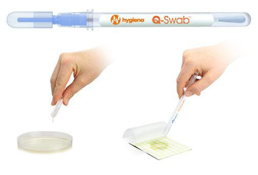 Q-Swab is a ready-to-use sample collection and delivery device for environmental surface sampling. Simply collect an environmental sample and snap the bulb at the top of the device to release 1ml of media into the sample. The letheen broth media neutralizes residual sanitizers and facilitates recovery of bacteria. After activation, the sample is ready to be poured onto sample-ready media film or streaked onto plates for culturing. Q-Swab can be used either wet or dry to sample surfaces.