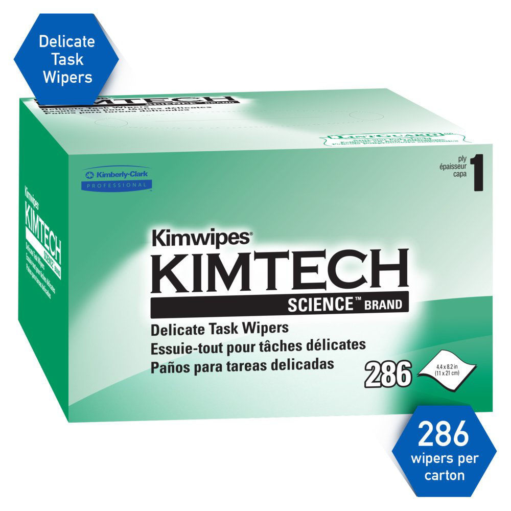 Kimtech Science® Kimwipes® Delicate Task Wipers are a single ply, light-duty wiper that can handle a variety of delicate tasks. Easily wipes up liquid and dust. Anti-stat dispensing reduces lint and electrostatic discharge and controls usage. Portability reduces waste. One-at-a-time dispensing.