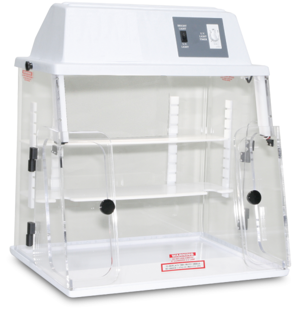 Plas-Labs PCR Chambers have been designed to help improve the accuracy of PCR and general tissue culture procedures. The chance for airborne contamination during DNA sequencing is greatly reduced. The Plas-Labs PCR chamber is a "still air enclosure" which contains both fluorescent and UV germicidal lamps which will decontaminate all surfaces of the interior. The UV lamp should be activated 15 minutes prior to and 15 minutes after planned use. The front viewing panel is 0.5" (13 mm) thick optically clear material, is extremely effective for protection against 32P labeled compounds, and is very effective against beta rays but not gamma rays. Access to the interior chamber is gained by pushing the thumb knobs and lifting off the corner doors. The doors are removable therefore do not take up valuable laboratory counter workspace. If a corner door is opened, proximity sensors turn off the power to the UV system.