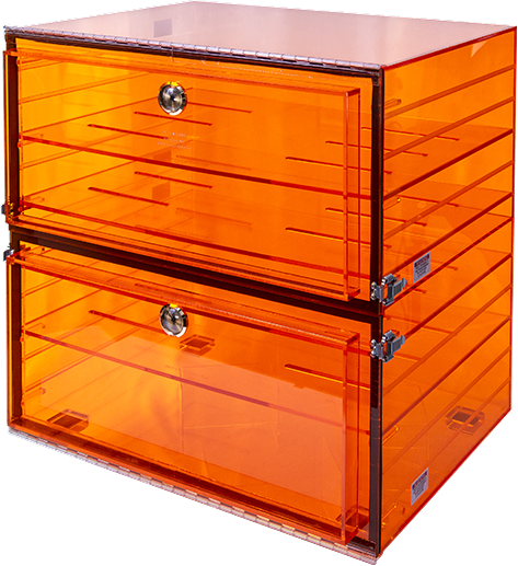 Under a slight positive N2 charge they prevent moisture from penetrating the molecular structure of stored components. Amber colored units are very effective for protection from harmful UV rays for light sensitive components.