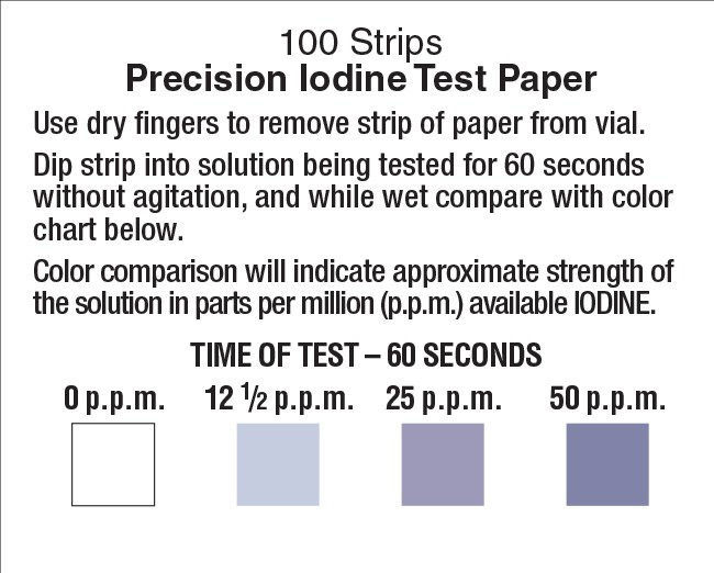 The Iodine test paper detects available Iodine in solutions in increments of 0, 12.5, 25, & 50 ppm. Disinfection with Iodine occurs between 12.5 ppm and 25 ppm. This is an older method for sanitizing utensils and dishware used in the restaurant trade.