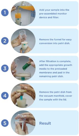 - All in one assembly combines filtration unit and petri dish and helps to minimize contamination