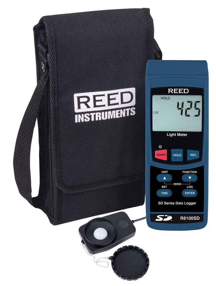 The Reed R8100SD Data Logging Light Meter has a wide measurement range up to 100,000 Lux (10,000 Foot Candles) and features data hold, min/max functions, and an easy-to-read backlit LCD display. Using a SD card (max 16GB), a user can manually record up to 99 readings or automatically by selecting a desired sampling rate from 1 to 3600 seconds. Quickly generate an Excel file with raw data, all without the use of software. Optional accessories include a tripod and AC adapter for continuous long-term monitoring.