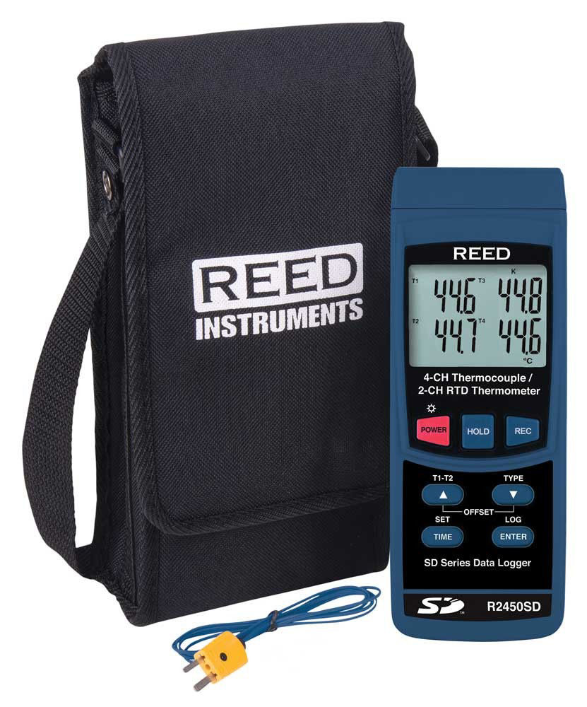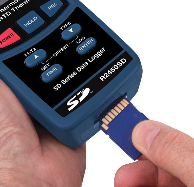 The R2450SD features Data hold, Max/Min functions, and an easy-to-read backlit LCD display. Using a SD card (max 16GB), a user can manually record up to 99 readings or automatically by selecting a desired sampling rate from 1 to 3600 seconds. Quickly generate an Excel file with raw data, all without the use of software. Optional accessories include a tripod and AC adapter for continuous long-term monitoring on up to 4 separate channels.