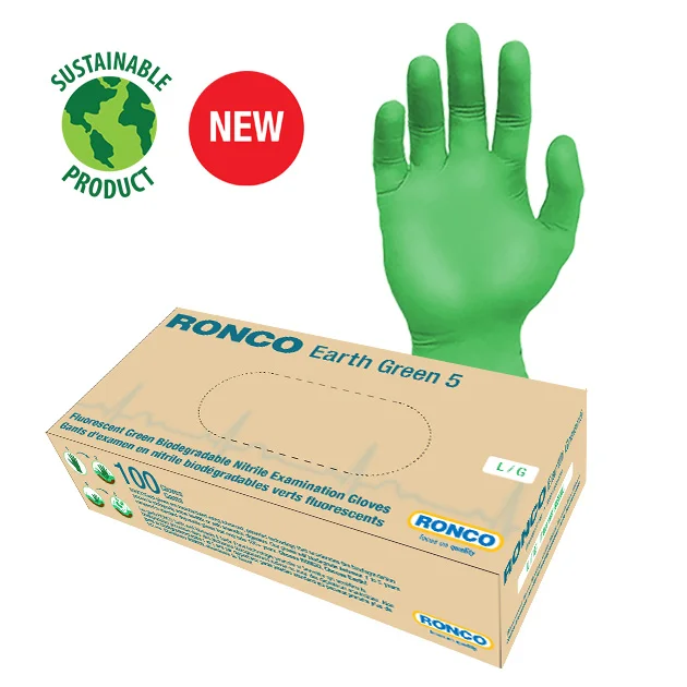 Ronco Earth™ 5.0mil Fluorescent Green Nitrile Gloves are our premium biodegradable gloves. Regular nitrile gloves take more than 100 years to biodegrade because they cannot generate significant microbial activity required to break down the polymer’s molecular structure.