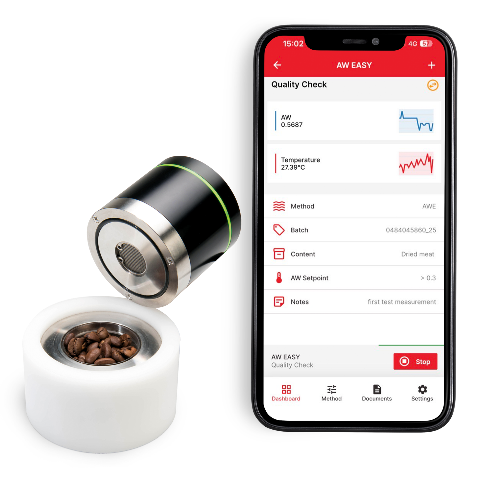 The Rotronic AwEasy Bluetooth Water Activity Meter can be used with the Smartphone together with the free AwEasy App for iOS and Android.