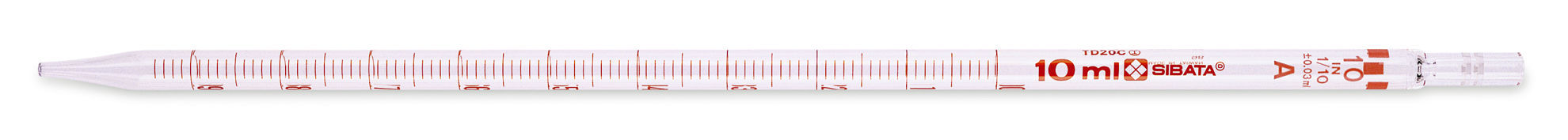 Sibata class A, reusable serological pipets meet ASTM E-1044 Style 1 specifications. These pipets are graduated to the tip (tempered) and are also calibrated to deliver. Feature permanent amber markings and color-codings which are enameled onto the glass. The top end of sizes 5 ml to 25 ml is constricted.