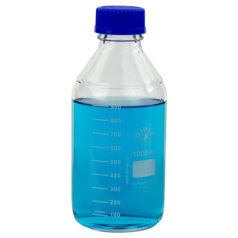 Simax® clear graduated borosilicate glass media bottle with GL45 blue polypropylene unlined screw cap. This borosilicate glass general purpose media bottle is autoclavable with permanent white graduations and marking spots. The screw thread opening has an inner diameter of approximately 30mm. The GL45 cap is liner-less and both the cap and drip-free ring are polypropylene and autoclavable to 140°C. Maximum use temperature of bottles is 450°C.